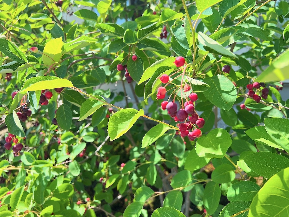 ジューンベリー(Juneberry)という名前のとおり、今年も6月に入ると庭のジューンベリーが赤い小さな実をたくさんつけました。
