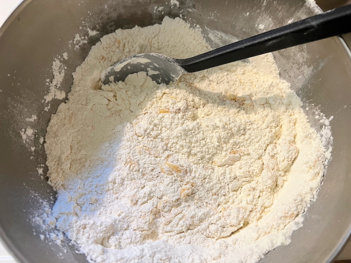下準備でふるいにかけた薄力粉・強力粉・ベーキングパウダーを加え、へらで切るように混ぜます。