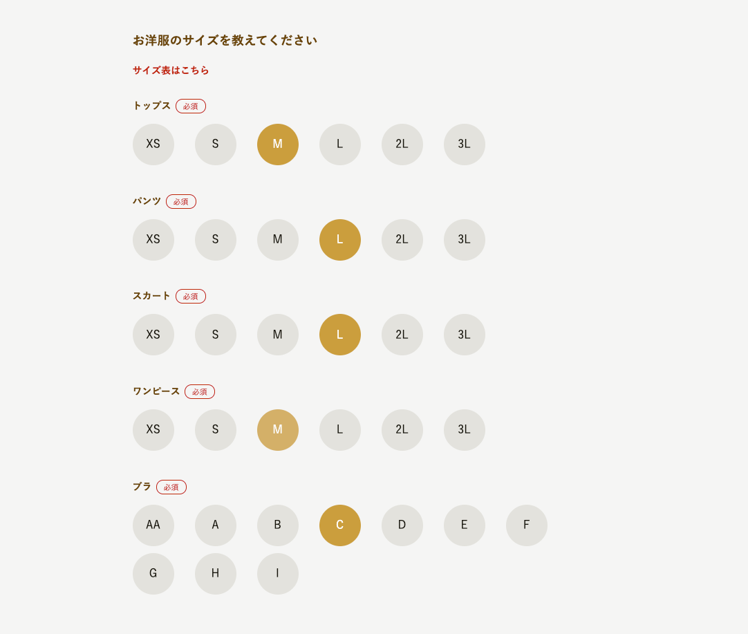 下半身太りタイプなので、トップスはMなのにパンツとスカートはLを指定しています。