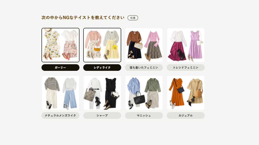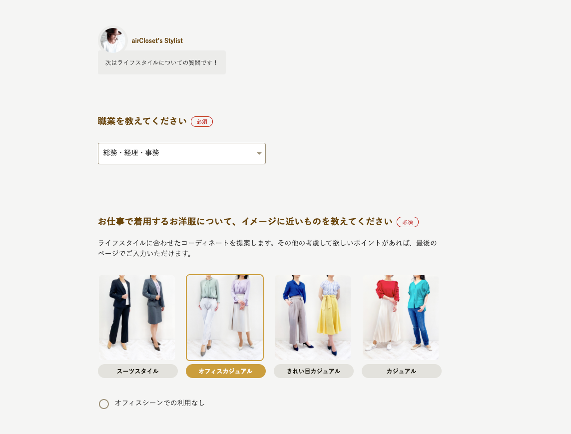 この画像では「オフィスカジュアル」を選びましたが、自前のベーシック服にこの写真のような服を合わせたら地味になりすぎる気がして後から「きれい目カジュアル」に変更しています。
