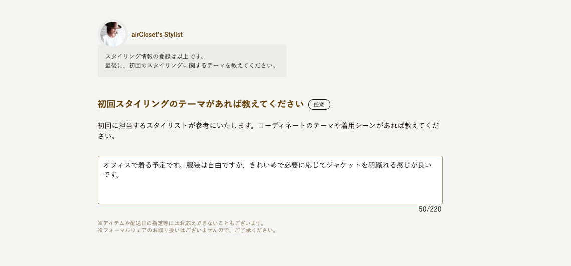 初回スタイリングのテーマ(コーディネートのテーマや着用シーン)を伝える欄です。