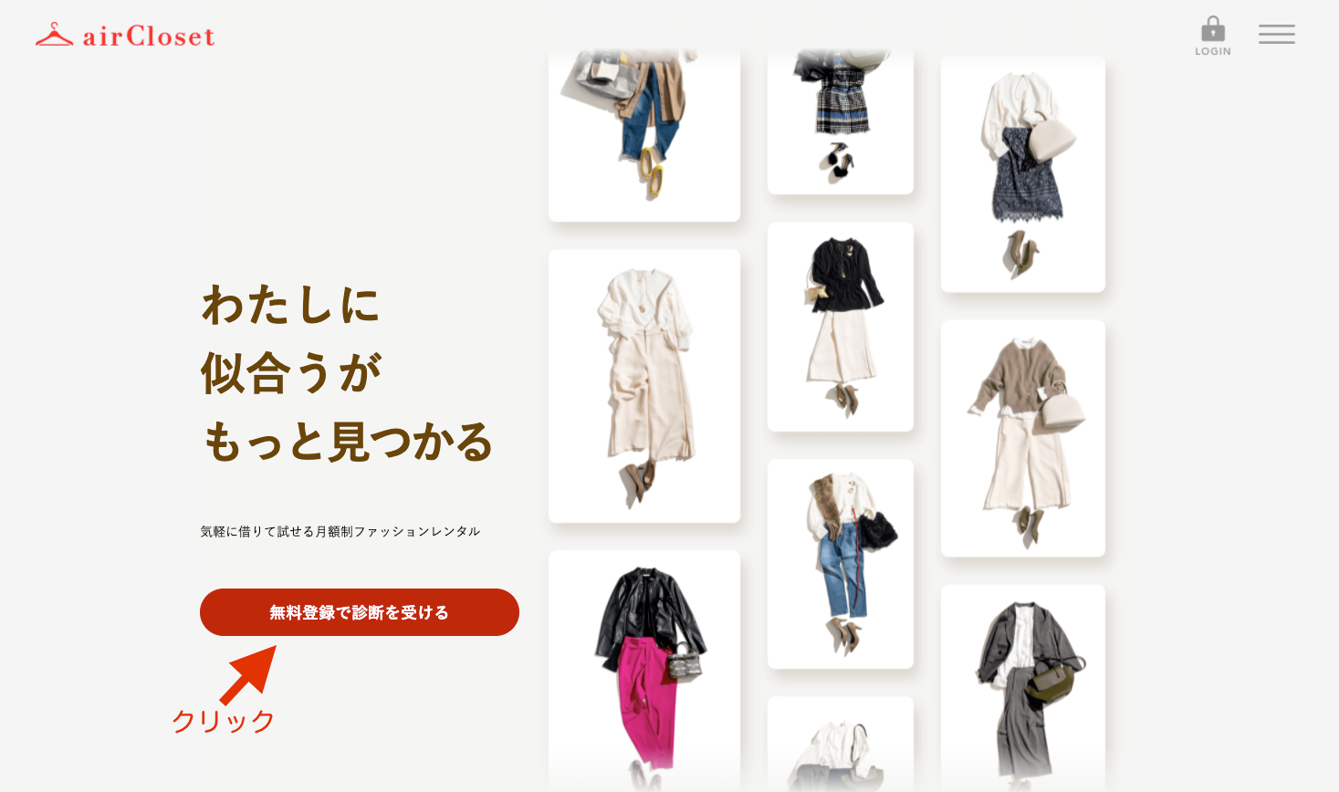 エアークローゼットの公式サイトを開いて「無料登録で診断を受ける」をクリックします。