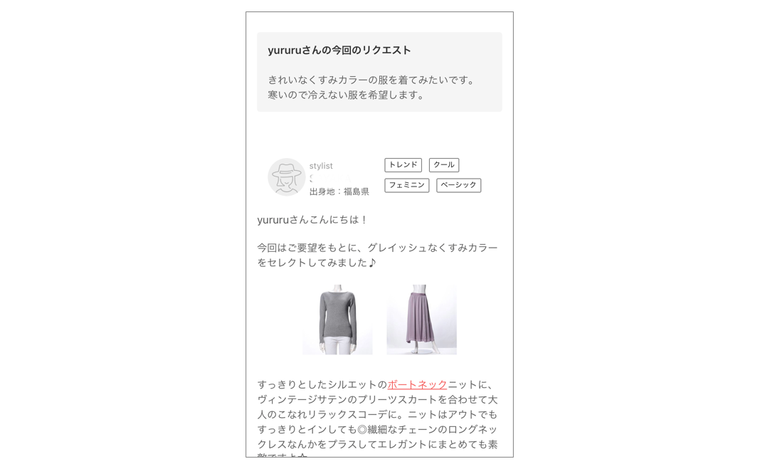 選んでもらった服がリクエスト通りで、自分の好みにもぴったりだったので2週間たのしい気分で着回しを楽しめました。