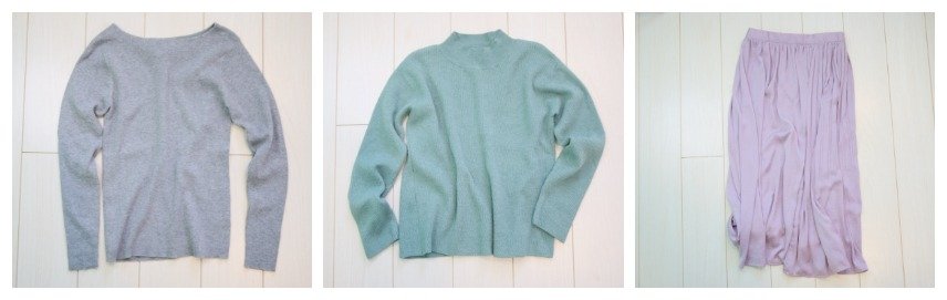 「きれいなくすみカラーの服を着てみたい。寒いので冷えない服が良い」とのリクエストどおり、きれいなくすみグリーンとくすみピンクのニット&スカートが届きました。