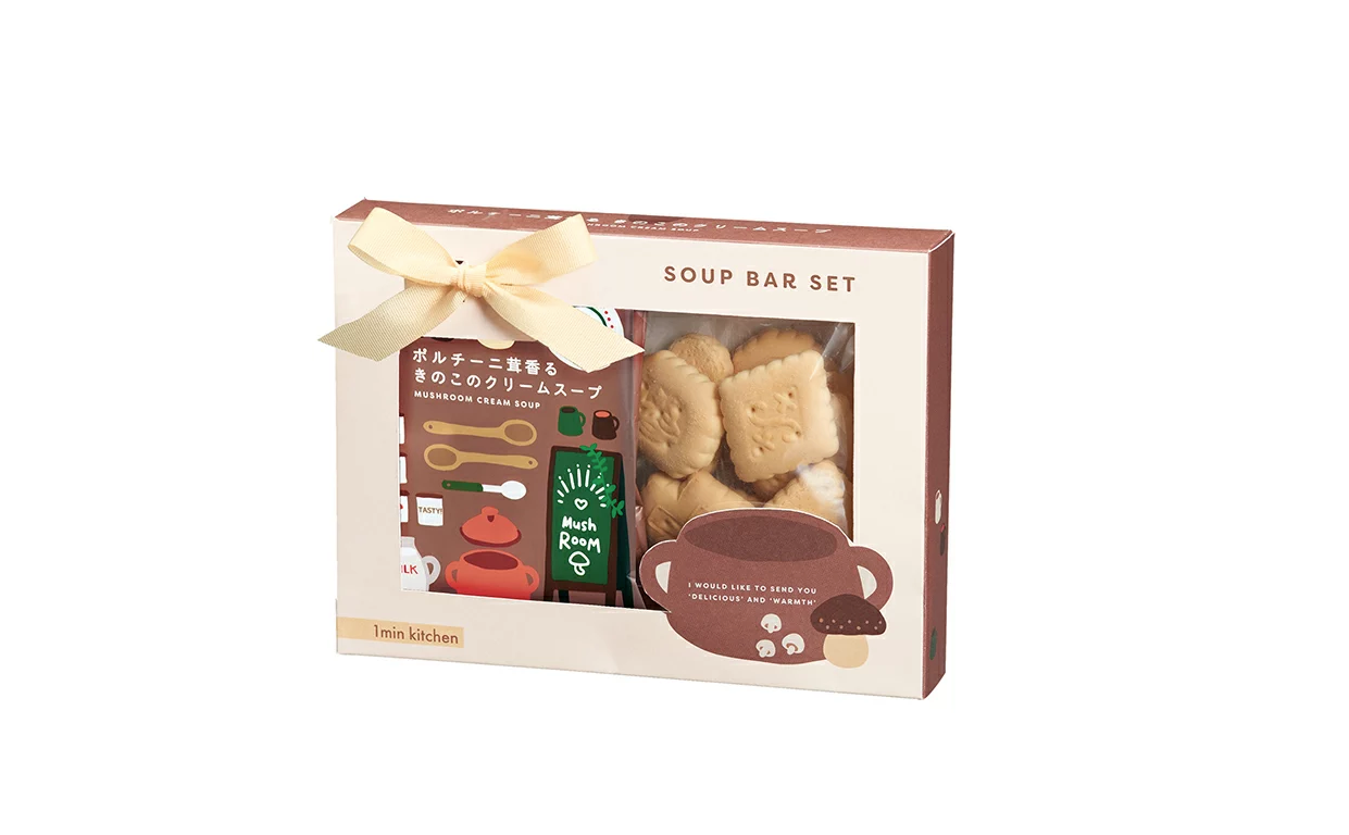 お湯を注ぐだけで食べられる、こだわりの絶品スープと、スープと一緒に食べるかわいい形のビスケットのセットです。