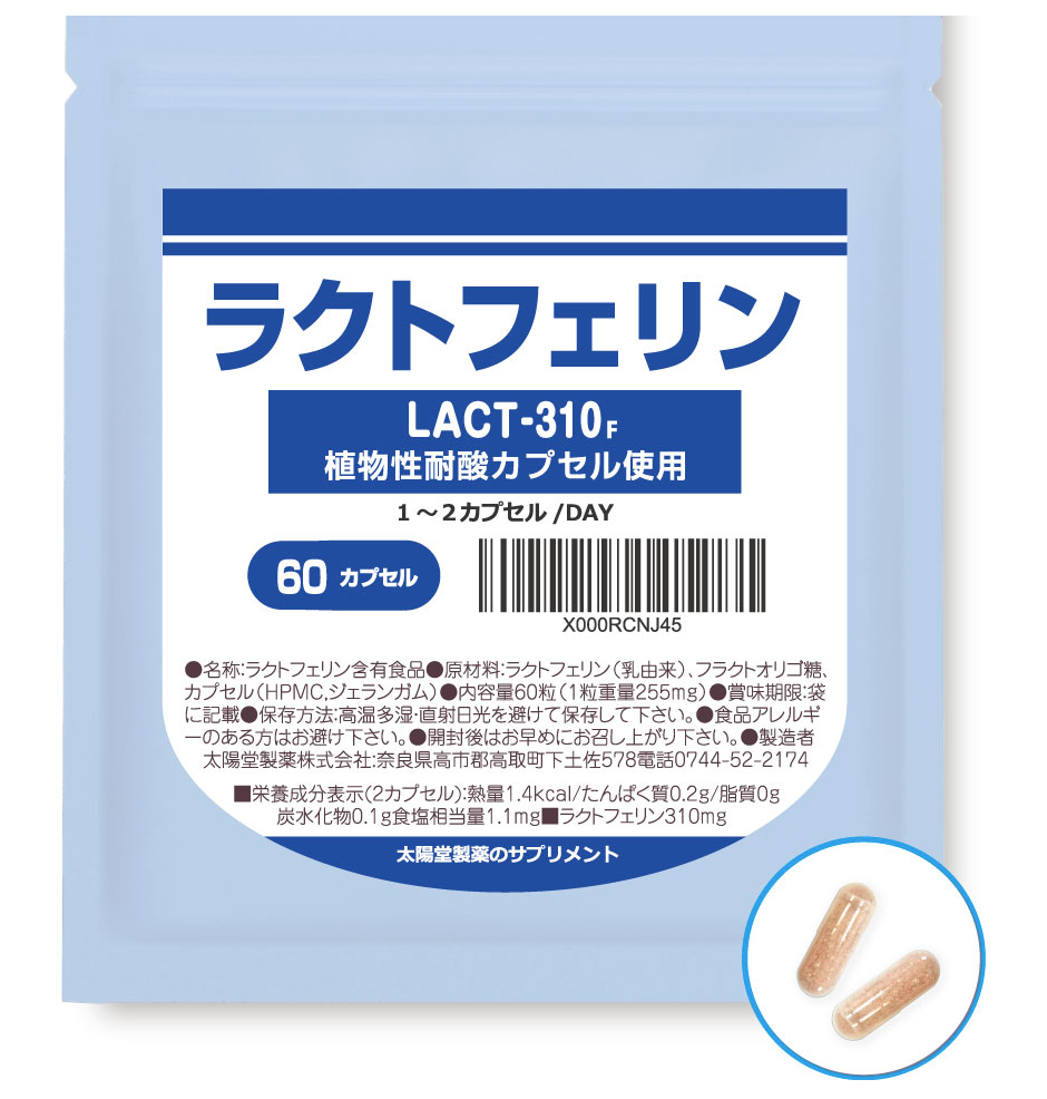 | 原材料 | デキストリン、セルロース、ラクトフェリン(乳由来)、 レシチン(大豆由来)、微粒二酸化ケイ素、ステアリン酸カルシウム |
