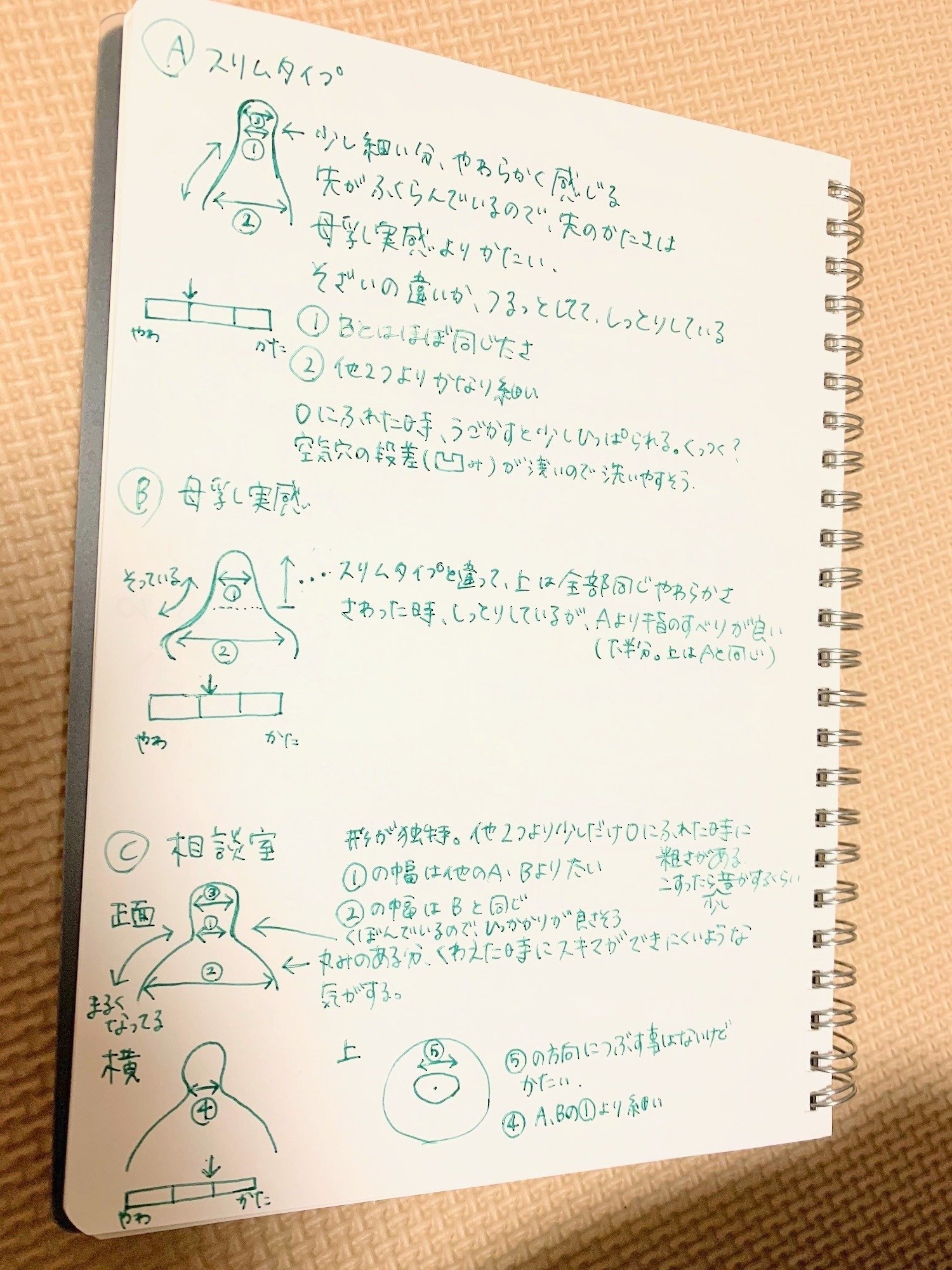 | 母乳相談室 | 2 | ・乳首の形状が非対称に作ってあり、部分によって硬さが違う ・3つの中では一番固い ・少しざらざら感がある素材 |