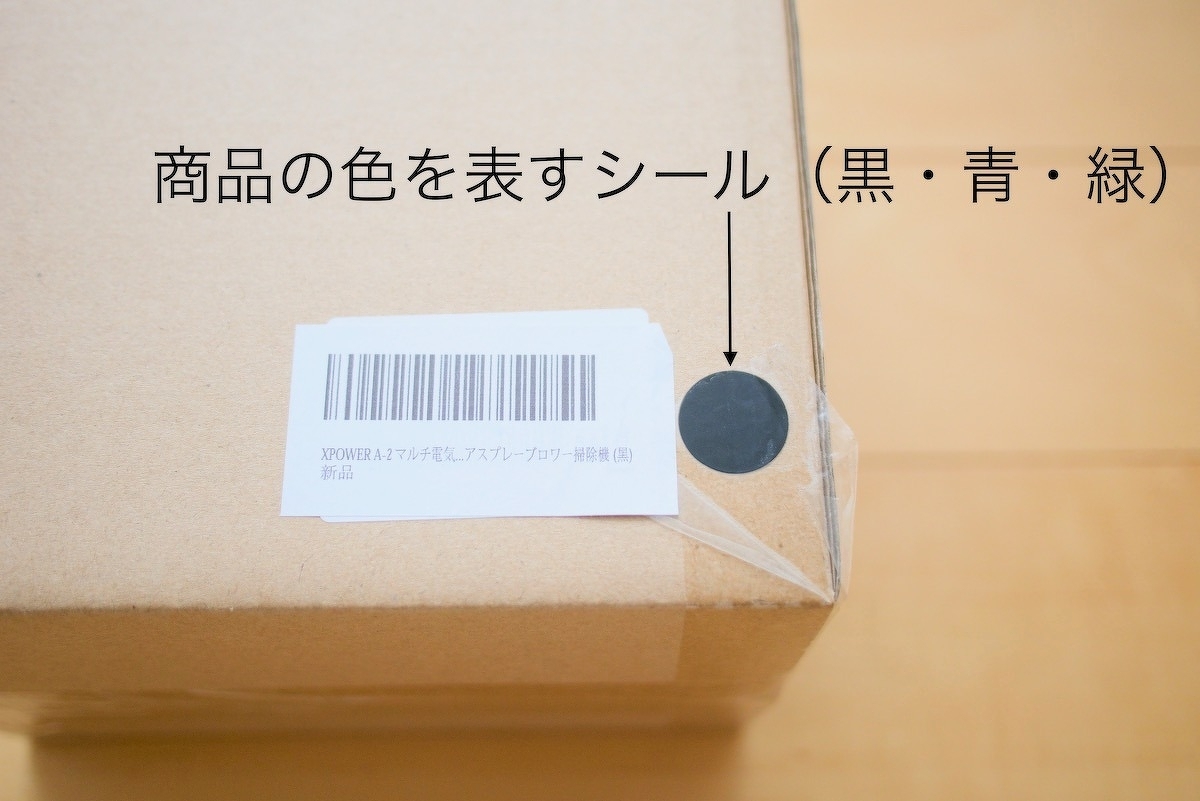 段ボール箱には商品の色を表すシール(下の画像)が貼ってあるので、注文した色と一致しているか確認をおすすめします。