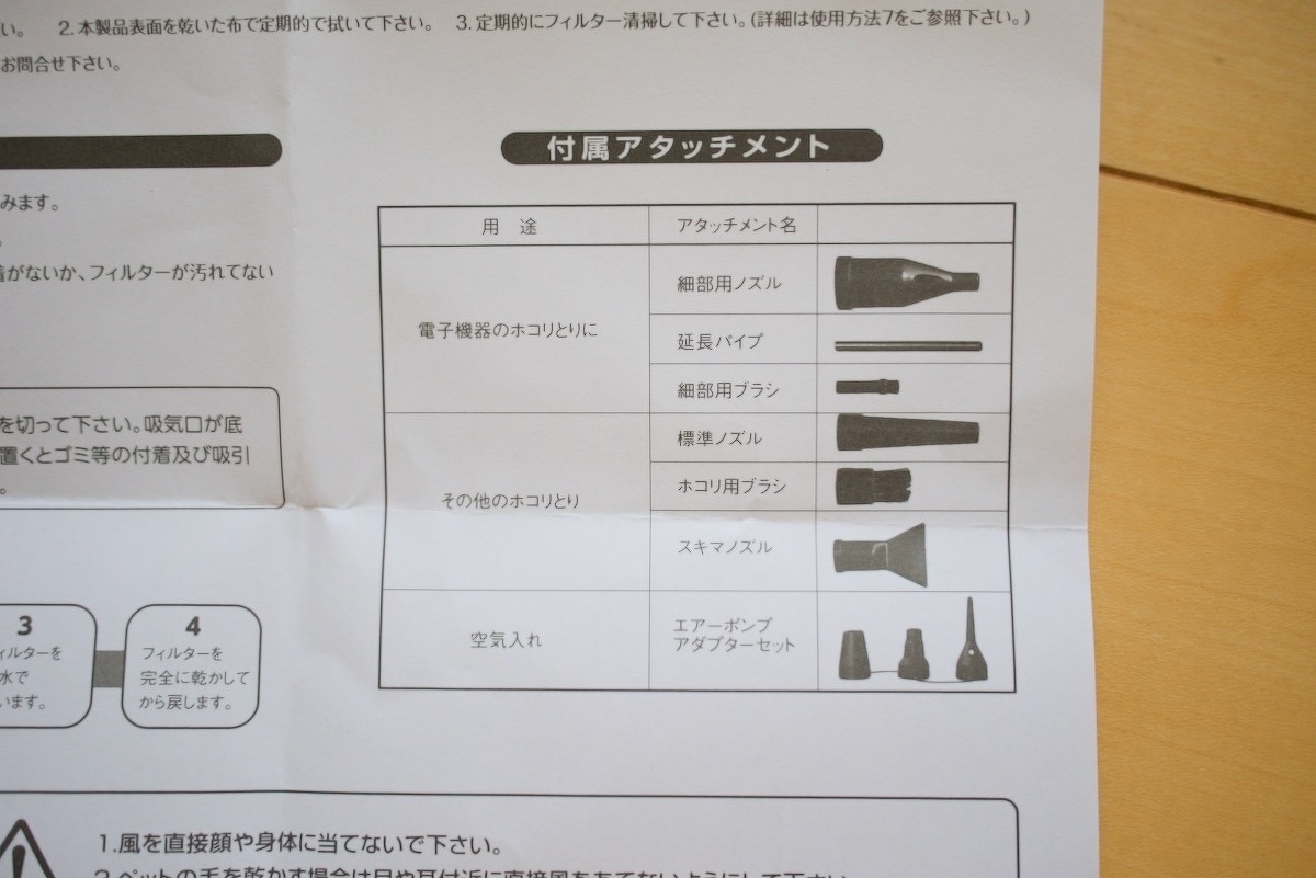 精密機器用の細いノズルとは別に、普通掃除用の広めのノズルも付属しています。