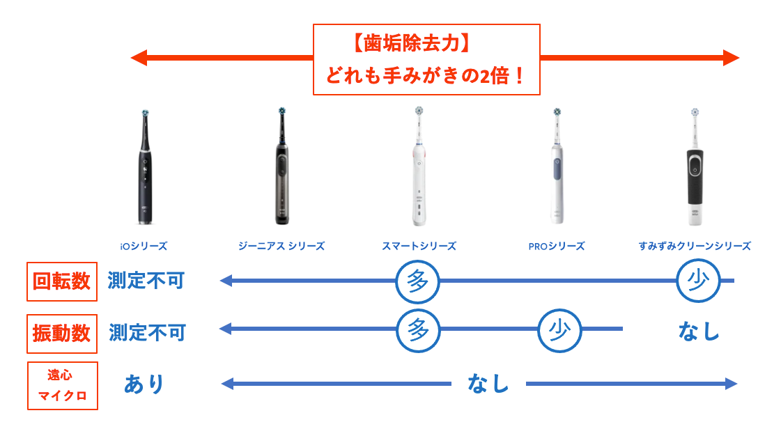iOシリーズは「搭載されている本体機能の関係で測定ができない」が、「歯垢除去力はシリーズの中で最も優れている」とのことです。
