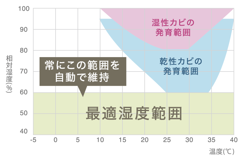 湿度60%を超えると繁殖しやすくなるカビの繁殖を抑えます!