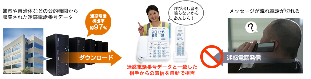 着信時に「警告(録音する旨を相手に伝える)」「注意喚起(迷惑電話に注意するようメッセージを流す)」「自動録音」の3ステップで、迷惑電話を防止する機能を備えています。