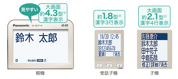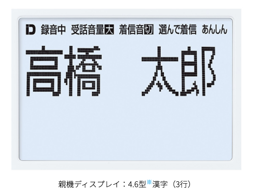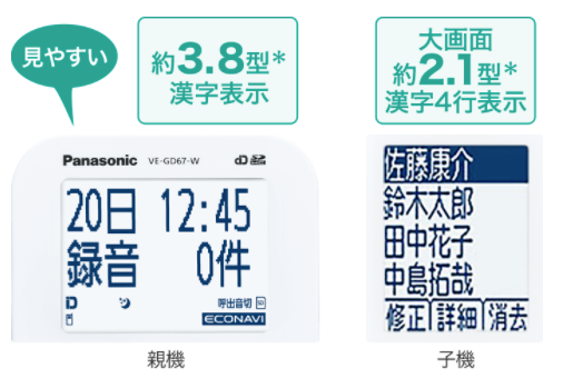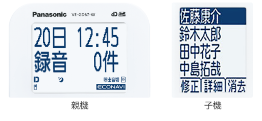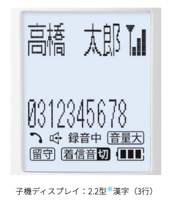 下の画像は液晶画面のサンプルですが、親機・子機ともに漢字表記で文字もとても大きく読みやすいです。