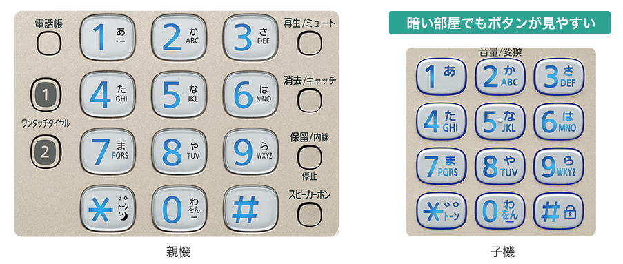 ダイヤルボタンの文字が光るなど、暗いところでも見やすいように工夫されている機種もあります。