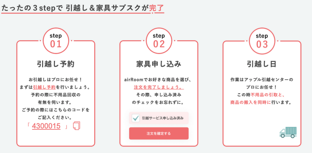 下の画像のように、3stepで 引越し&家具サブスクが完了します。