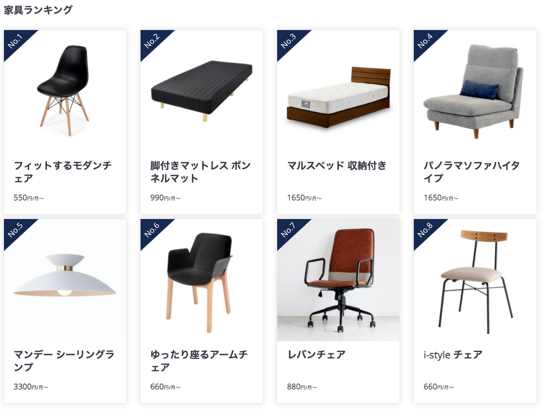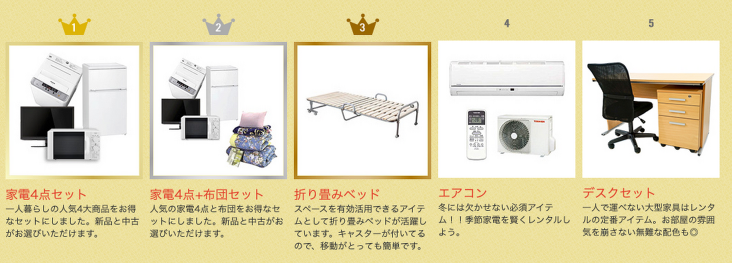 こちらは家電一式のセットプランがあることや、30日からと短い期間のレンタルにも対応しているのが特徴です。