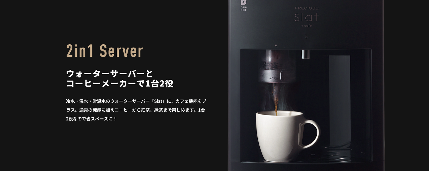 一般的なウォーターサーバーの冷水・温水・常温水の機能に加え、カフェ機能が追加されたウォーターサーバー「Slat+cafe(スラット+カフェ)」です。