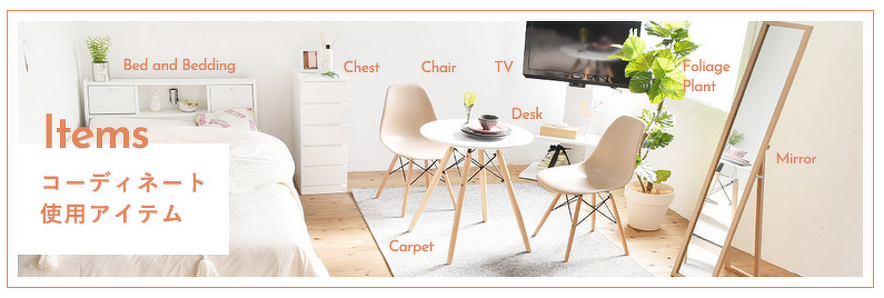 プロのインテリアコーディネーターが考えた家具セットが用意されており、アイテムをまとめてレンタルできるので、かんたんに素敵な部屋をつくることができます。下の画像はコーディネートセットの一例です。