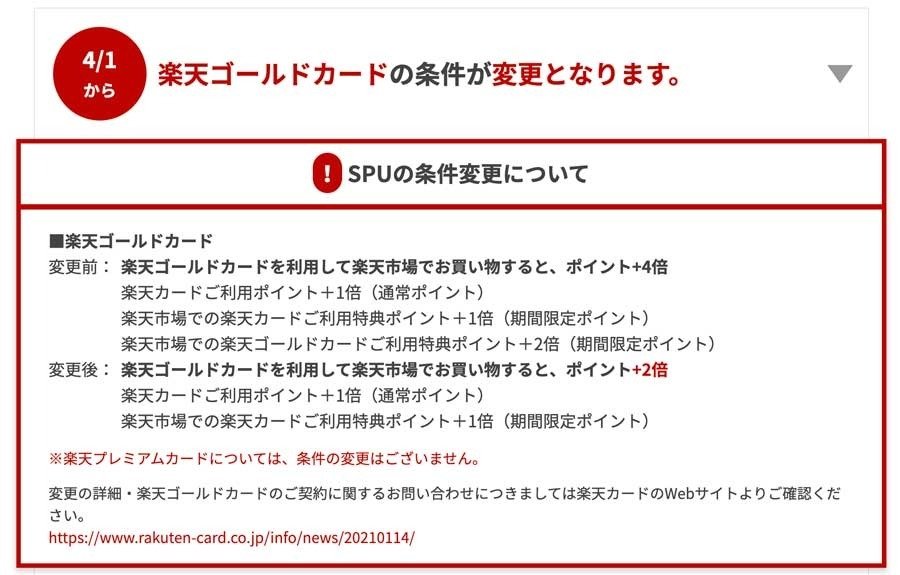- 楽天ゴールドカードのポイント(+4倍)が楽天カードと同じ(+2倍)になる
